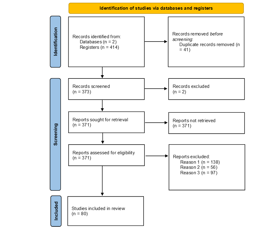 The 414 articles were first screened using EndNote software for automatic identification of duplicates, resulting in the removal of 41 records. This left 373 records for analysis, from which two additional duplicates were removed manually. Of the 371 records analysed, 138 were excluded because they were not published in journals whose scope aligned with themes such as “marketing”, “consumer”, “sustainability”, “fashion”, or “management” (Exclusion reason 1). A further 56 articles were excluded following abstract screening (Exclusion reason 2), as they did not contribute meaningfully to answering the research question. Finally, a more in-depth review excluded 97 articles whose object of study, methodology and/or findings were not compatible with the aims of this systematic review (Exclusion reason 3). Thus, 80 articles were included in the final review, from which the results and insights presented in the following chapter are drawn.