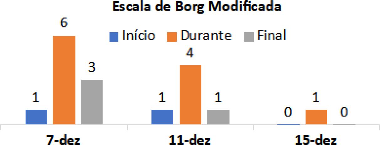 No decorrer das sessões, a Srª D. Maria não teve nenhum episódio de dor, antes e após as intervenções realizadas. Já no que diz respeito à dispneia, houve necessidade de realizar esta avaliação no início, durante e no final de todas as sessões de RFR, sendo os resultados apresentados no Gráfico 1.