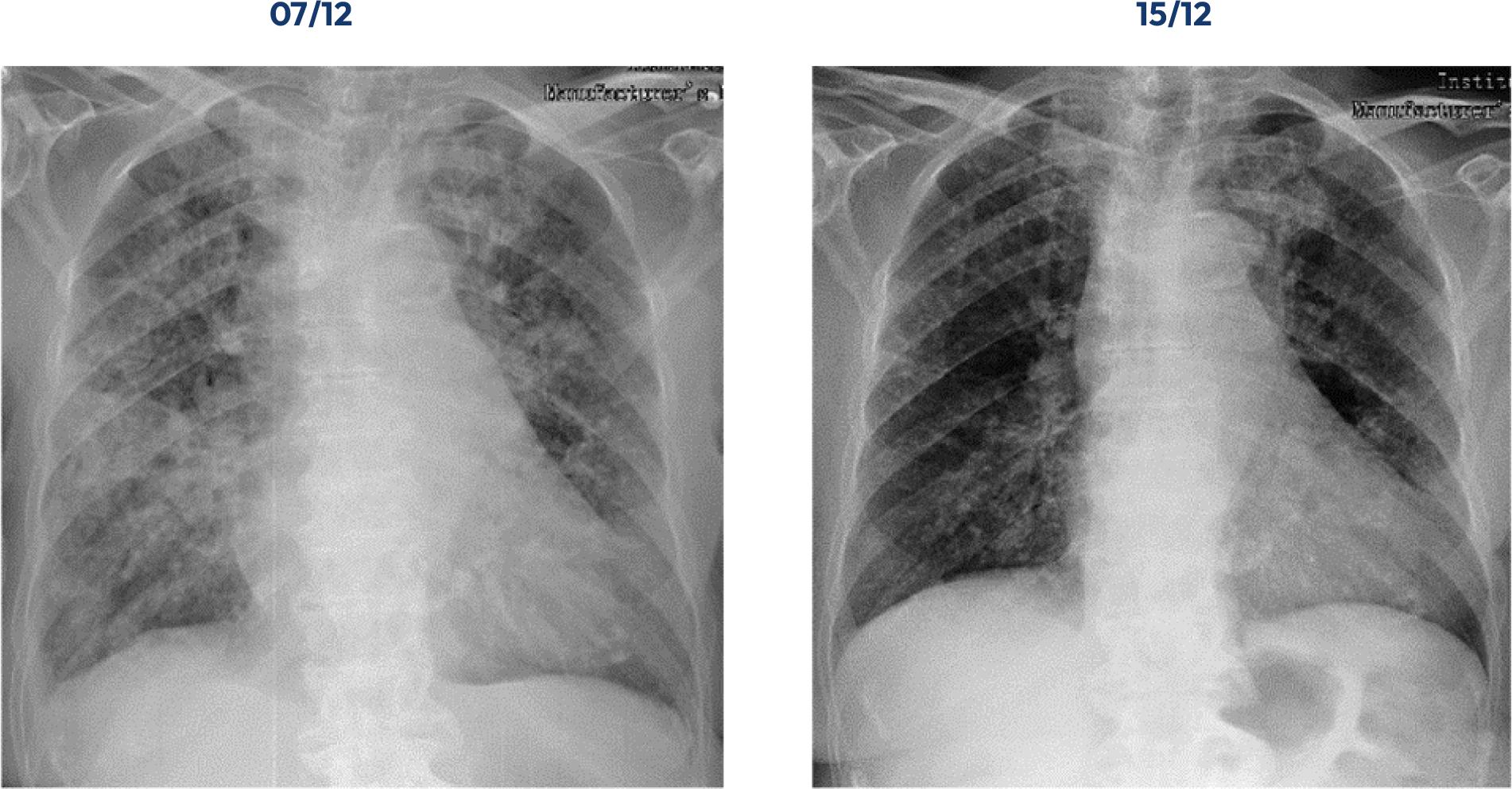 Neste tipo de doença, os exames complementares de diagnóstico são fundamentais para avaliar a patologia respiratória e a sua evolução. Na Figura 1, está presente a evolução imagiológica através de telerradiografia de tórax da Srª D. Maria.