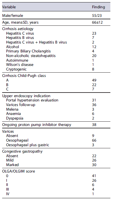 Foram incluídos 78 doentes cirróticos (sexo masculino: 55; idade média: 66 ± 12 anos). Considerando resultados positivos do EndoFaster® quando pelo menos um dos dois testes (amónia e pH) apresentava valor positivo, os VPNs atingiram 89% e 86% para exclusão de infeção por H. pylori e lesões pré-malignas extensas na mucosa gástrica, respetivamente, com uma acuidade global de 83% e 74%.