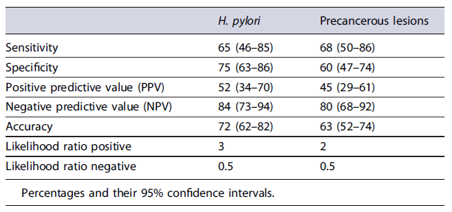 Frequencies, percentages and means values with standard deviations were calculated for all observations. Sensitivity, specificity, positive predictive value (PPV), NPV, the overall accuracy, and the likelihood ratios were calculated by considering the histology as gold standard for both H. pylori infection and extensive precancerous lesion on gastric mucosa. To assess the cumulative impact of gastric juice analysis for clinical practice, the accuracy values were also calculated by combining data of both results of testing, by considering eventually missed diagnosis when both tests were negative, but histology revealed at least one of the investigated conditions (H. pylori and/or pre-cancerous lesions).