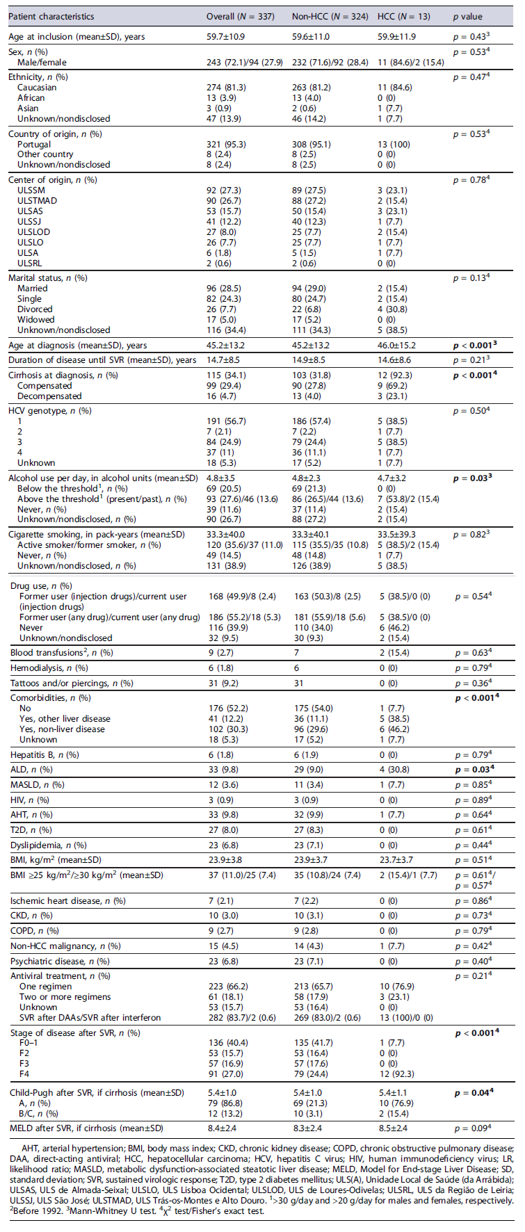 The present study included 337 patients from eight Portuguese centers. Table 1 displays the sociodemographic and clinical characteristics of the study population. Patients presented a mean age at inclusion of 59.7 years and most were male (72.1%), Portuguese (95.3%), and Caucasian (81.3%). The average duration of disease until SVR was 14.7 years. About one-third of patients had cirrhosis at diagnosis.