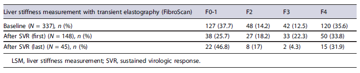 Vibration-controlled TE (FibroScan) was used for LSM. LSM was assessed before SVR in all patients (baseline) and it was reassessed after SVR in a subgroup of patients. When more than two LSM values post-SVR were available, only the most recent and the last values were considered. The final value corresponded to the median of the values attained, with a minimum of 10 valid measurements and an interquartile range/median value <30%. The four stages of fibrosis defined according to LSM were F0-1for values <7kPa,F27-10 kPa, F3 >10 kPa, and F4 >13 kPa [19].