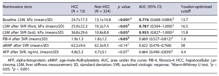 The predictive accuracy of TE, FIB-4, aMAP, and AFP regarding the development of HCC is presented in Table 4. FIB-4, aMAP, and AFP showed a weak accuracy. Regarding TE, the values measured before SVR (AUC 0.776) and the first LSM after SVR (AUC 0.787) revealed a fair accuracy to identify HCC. The most recent LSM presented the numerically highest AUC (0.935).