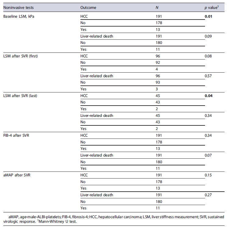 Regarding the prediction of HCC in patients with at least a 24-month follow-up (N = 191, 56.7%), only LSM was significantly higher, both when measured before SVR (p = 0.01) and for the most recent measurement after SVR (p = 0.04), but none of the noninvasive tests studied presented statistical significance in the prediction of liver-related death (shown in Table 5).