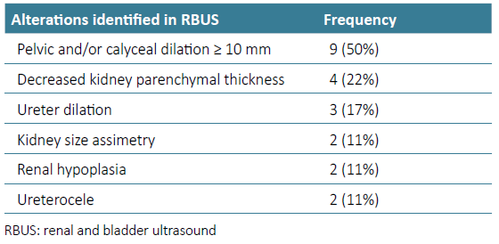 RBUS was performed in most cases during the acute episode (74%), with the remaining being done within the next 6 weeks in 24% of cases and 2% after more than 2 months. When alterations were identified in the RBUS performed in the acute episode, it was repeated at least 6 weeks after to confirm the findings. Abnormal findings were identified in 18 RBUS (7%), with four patients presenting more than one alteration. The most common alterations were pelvic and/or calyceal dilation of 10 mm or more which was identified in nine patients (50%), followed by decreased kidney parenchymal thickness in four cases (22%) (Table 2).