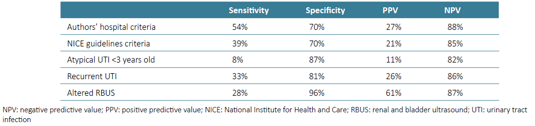 The objective of this study is to access the impact of these practice changes. The specific aims are: i) to define the sensitivity and specificity of the new criteria to diagnose renal scars after UTI; ii) to identify in how many patients the diagnosis of renal scarring would be missed according to the updated criteria; iii) to study whether RBUS would avoid missing renal scarring in patients that did not meet the NICE criteria.