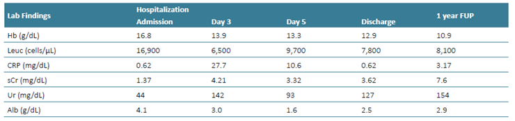 He was admitted to the emergency department with acute dyspnea, hypertension (220/110 mmHg), and peripheral edema. He was diagnosed with hypertensive pulmonary edema and started on non‑invasive ventilation, intravenous diuretics, and bronchodilators with significant clinical improvement. At hospital admission, the patient had a stable kidney function, with serum creatinine (sCr) of 1.37 mg/dL (reference range < 1.2 mg/dL) and urea of 44 mg/ dL (reference range 17‑ 49 mg/dL), sodium of 136 mmol/L (reference range 136 ‑ 145 mmol/L), potassium of 4.10 mmol/L (reference range 3.5 - 5.0 mmol/L) and a urine dipstick with protein +++ and microscopic hematuria +. His serum hemoglobin was 16.8 g/dL, white blood cell (WBC) count of 16 900 cells/µL (reference range from 4000 - 10 000/µL), he had a normal serum albumin (4.1 g/dL; reference range > 3.5 g/dL) and a low C‑reactive protein (CRP) level (0.62 mg/dL; reference range < 0.5 mg/dL). Despite an initial favorable evolution, the patient remained hypoxemic, requiring supplementary oxygen by nasal cannula and was subsequently admitted to the Internal Medicine ward.