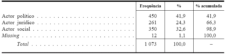 Criámos também uma variável categórica mais ampla para os requerentes e distribuímo-la em três categorias: actores políticos, jurídicos e sociais. Como sabemos, no Brasil o número de entidades com legitimidade para este efeito é comparativamente superior ao dos países europeus, o que de certa forma possibilita essa reclassificação e uma reflexão maior sobre a acção em conjunto destes actores. Ao alargar essas entidades para categorias maiores, é possível observar, como mostra o quadro n.º 2, que os actores políticos correspondem a 41,9%, sendo seguidos pelos actores sociais com 32,6% e pelos actores jurídicos com 24,3%.