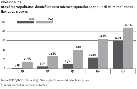 Segundo os referidos gráficos, no ano de 2001, por exemplo, 59% dos domicílios no quintil mais rico da população (Q5) possuíam computadores; em 2009 essa percentagem subiu para 86%. Para o quintil mais pobre (Q1) os valores ficaram em 1,6% em 2001 e 13% em 2009.