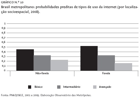 Portanto, os dados apresentados acima evidenciam que tanto o nível socioeconómico quanto a localização socioespacial e também a idade constituem critérios importante de nivelamento no que diz respeito ao tipo e competência de uso da internet. São justamente indivíduos jovens, com maior nível de recursos materiais (rendimentos) e imateriais (escolaridade), localizados fora de favelas, aqueles com maiores probabilidades de melhor aproveitarem o leque de oportunidades oferecido pela internet. Assim, as camadas dominantes da população possuem vantagens não somente em relação ao acesso, mas também em relação à capacidade de uso da internet, confirmando a hipótese levantada por Castells (2007) a respeito do processo de infoexclusão.