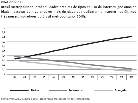 Mas os nossos dados também evidenciaram que não basta ter acesso à internet, pois encontramos grandes diferenças quanto à competência de uso da mesma entre indivíduos conectados. Mais do que isso, vimos que há enormes diferenças sociais quanto à capacidade de aproveitamento das oportunidades oferecidas pela rede, pelo que indivíduos com maior renda e escolaridade possuem muito mais probabilidade de fazerem um uso mais avançado dessa tecnologia. Além disso, percebemos que também há uma grande diferença geracional nessa capacidade de uso, já que indivíduos com mais anos de idade apresentam uma probabilidade muito maior de fazerem uso apenas básico da internet. Ou seja, além de se promover a necessária expansão e barateamento do acesso à internet, seria ainda mais importante garantir o acesso aos dispositivos de uso da rede o microcomputador, no caso estudado e, principalmente, estimular as condições e capacidades necessárias ao pleno aproveitamento das oportunidades oferecidas pela mesma, com enfoque na população menos abastada, menos escolarizada, e com idade mais avançada.