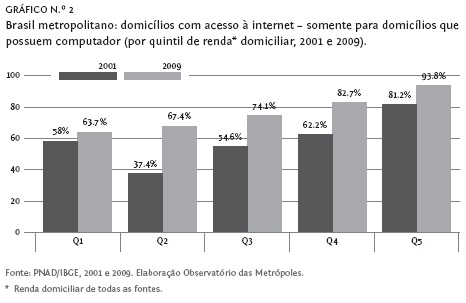 Em relação ao acesso à internet dada a posse de computador também é possível notar grandes desigualdades. Em 2001, 81% dos domicílios no quintil mais rico da população que possuíam computador, tinham também acesso à internet (gráfico n.º 2); em 2009 esse valor subiu para 93%. Para o segundo quintil mais pobre as percentagens ficaram em 37% em 2001 e 67% em 2009. Assim, nos últimos anos verificamos, para todos os quintis de renda, um aumento significativo de acesso ao computador e à internet. Além disso, em termos proporcionais foram os quintis mais pobres aqueles que mais aumentaram o seu acesso a essas tecnologias, o que pode estar relacionado com o aumento do montante de renda dessas camadas nos últimos anos (Barros et al., 2010).11