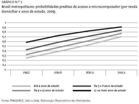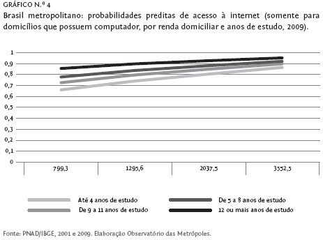 Os gráficos atrás ajudam-nos a entender melhor a dimensão dos efeitos das variáveis socioeconómicas e territoriais, mantendo-se constantes todas as demais variáveis. Através dos gráficos n.º 3 e n.º 4 podemos ter acesso aos efeitos da escolaridade e da renda sobre a posse de computador e acesso à internet. Enquanto o efeito da renda (cujos valores expostos correspondem aos intervalos dos quintis de sua distribuição) deve ser visualmente mensurado pelo grau de inclinação das retas, o efeito escolaridade deve ser graficamente identificado pelo espaço entre as diferentes retas. Em primeiro lugar, devemos destacar que tanto a renda como a escolaridade possuem efeitos bastante agudos. É possível perceber, em segundo lugar, que tanto o efeito renda quanto o efeito escolaridade são mais acentuados em relação à posse de microcomputador do que em relação ao acesso a internet, já que no primeiro gráfico encontramos uma maior inclinação e um maior espaço entre as retas. Ou seja, no Brasil a barreira socioeconómica de acesso à internet no domicílio inclui aspetos materiais (renda) e imateriais (escolaridade), e encontra-se mais presente sobre a posse de microcomputador do que sobre o acesso à internet.