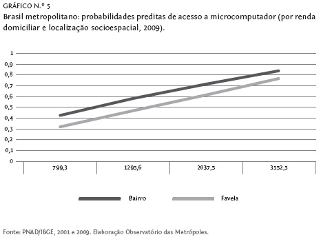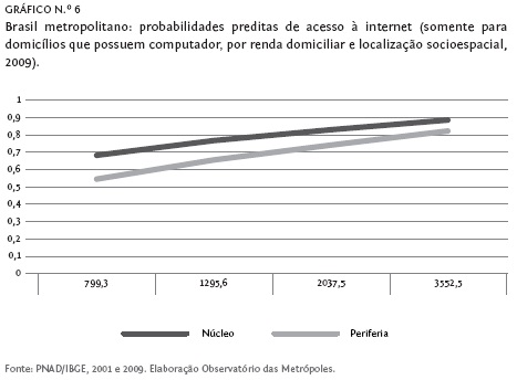 Em relação ao gráfico n.º 5 acreditamos que reflita o efeito de contexto gerado pela concentração espacial de uma população em desvantagem. É possível que o isolamento social da população moradora em favelas, ao colocar em contacto famílias de nível socioeconómico próximo, crie um meio-social desvantajoso, em que a posse de computador não seja tão valorizada como noutros contextos sociais. Já a vantagem do núcleo sobre a periferia no que diz respeito à conexão de internet expressa no gráfico n.º 6 , deve ser explicada por outro efeito do território, mas sem ligação à criação de contextos sociais ou recursos imateriais , mas sim à desigualdade de acesso a recursos e serviços materiais. Sabemos que as periferias metropolitanas costumam sofrer com a escassez de serviços coletivos e equipamentos de infraestrutura. É provável que também haja maior dificuldade, nessas áreas, de se encontrar provedores de acesso à internet.
