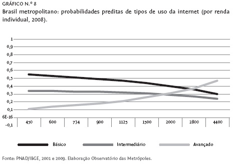 No suplemento de 2008 da Pesquisa Nacional por Amostra de Domicílios, além da existência da variável sobre o acesso ao computador e à internet, foram introduzidas variáveis que diziam respeito ao tipo de uso da internet nos últimos três meses no período de referência da pesquisa. Este suplemento forneceu-nos uma chave para compreender um pouco mais como os diferentes grupos sociais têm lidado com o conhecimento e técnica na utilização da internet.