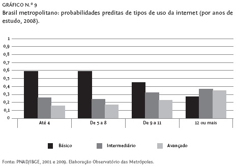 O mesmo pode ser dito em relação à escolaridade (gráfico n.º 9), que também exerce grande influência, aumentando consideravelmente as probabilidades de o indivíduo se encontrar na categoria intermediário e, principalmente, avançado diminuindo, portanto, as probabilidades do tipo básico , conforme caminhamos em direção aos níveis mais elevados de escolaridade. Diferentemente do efeito renda, no entanto, o efeito escolaridade está positivamente relacionado com a categoria intermediário. Tal resultado pode ser explicado pelo facto de a categoria intermediário ser caracterizada por um tipo de uso que mais pressupõe certos níveis de capital cultural, como educação e/ou aprendizado e leitura de jornais e revistas.21