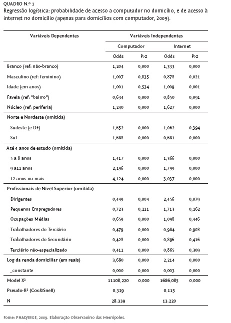 No quadro n.º 1, temos os resultados dos nossos modelos logit, cujas variáveis dependentes são a posse de microcomputador e o acesso à internet no domicílio dada a existência do microcomputador. Apesar de notarmos que variáveis de controleo como a cor, o género, a idade e a região geográfica possuem efeitos significativos sobre as possibilidades de acesso ao computador e/ou à internet, concentraremos a nossa análise nas características socioeconómicas e socioespaciais.12