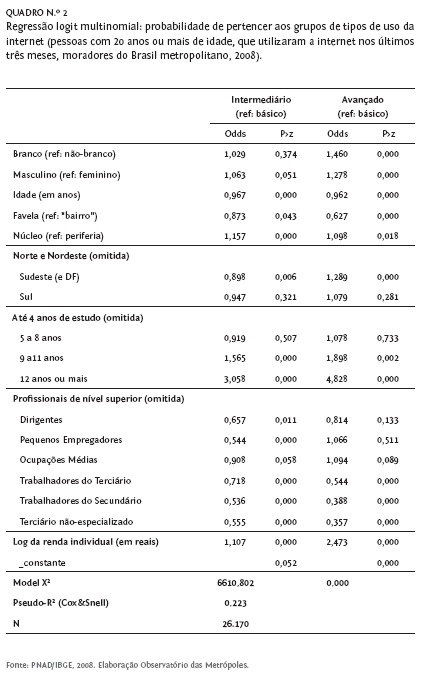 Além das estatísticas descritivas trabalharemos com modelos de regressão logit, cujas variáveis dependentes serão: a posse ou não de computadores no domicílio, e a existência ou não de conexões de internet nos mesmos; e como variáveis independente teremos a idade (em anos), género (sendo feminino a referência), cor (sendo não branco a referência), região (sendo norte e nordeste a categoria omitida)6, renda domiciliar de todas as fontes (logaritmo natural), escolaridade (em faixas, sendo até quatro anos de estudo a categoria de referência), o conjunto de dummies correspondente às categorias sócio-ocupacionais7 (sendo os profissionais de nível superior a categoria omitida) e as variáveis indicadoras da localização do domicílio em área de favela (sendo bairro a referência) e de núcleo (sendo periferia a referência) metropolitano.8 Na última secção construiremos uma tipologia de tipos de uso da internet e rodaremos um modelo logit multinomial a fim de verificar os fatores que influenciam as possibilidades de os indivíduos pertencerem a cada um dos tipos de utilizador.
