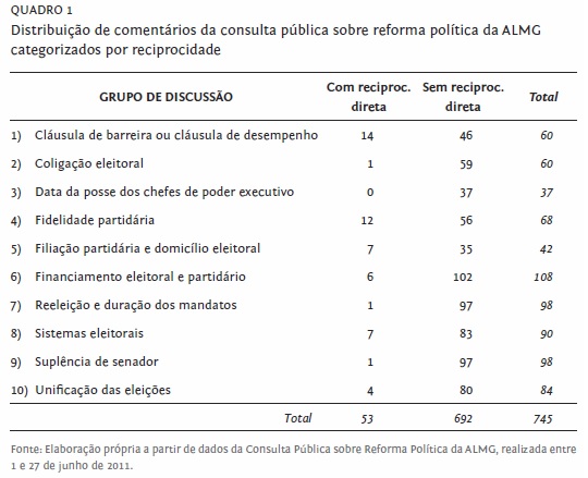 No total, as consultas públicas online da ALMG receberam 1858 comentários. A mais popular delas, alvo do presente texto, tratou do tema da reforma política e contabilizou 752 posts. Realizada ao longo de 27 dias em junho de 2011, a consulta foi dividida em dez fóruns: (1) cláusula de barreira ou cláusula de desempenho; (2) coligação eleitoral; (3) data da posse dos chefes de poder executivo; (4) fidelidade partidária; (5) filiação partidária e domicílio eleitoral; (6) financiamento eleitoral e partidário; (7) reeleição e duração dos mandatos; (8) sistemas eleitorais; (9) suplência de senador; (10) unificação das eleições.