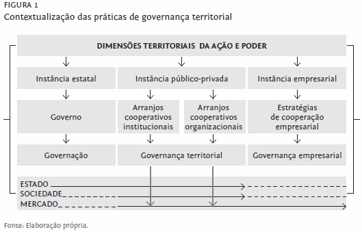 Conforme foi referido, a ações e relações de poder que ocorrem num determinado território provêm e incidem de/em instâncias de três tipos: estatal, público-privada e empresarial. É possível considerar que a instância estatal, por meio das ações de governo, concretiza o processo de governação4, interferindo nas demais instâncias através de regulamentações ou políticas verticalizadas. Da instância empresarial, por meio de formas diversas de cooperação, provêm as estratégias empresariais, que visam fins predominantemente económico-financeiros. A gestão das estratégias empresariais ocorre por meio daquilo que a bibliografia designa por governança empresarial.5