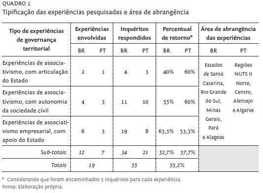 Sobre os procedimentos metodológicos, a investigação contemplou os seguintes aspetos: (a) estudos bibliográficos e sua sistematização; (b) elaboração de proposta metodológica para avaliação de práticas de governança territorial, com a estruturação de um instrumento de inquérito por questionário; (c) aplicação do questionário e análise dos resultados obtidos. Em seis das 19 experiências investigadas, três brasileiras e três de Portugal, foi ainda realizada uma visita de reconhecimento, contemplando entrevistas presenciais com atores, principalmente dirigentes. O teor destas entrevistas versou sobre questões relacionadas com dois aspetos: estrutura organizacional e de funcionamento; principais desafios e resultados alcançados. Estas visitas e entrevistas tiveram o propósito de contribuir para um melhor entendimento dos resultados dos inquéritos por questionário.