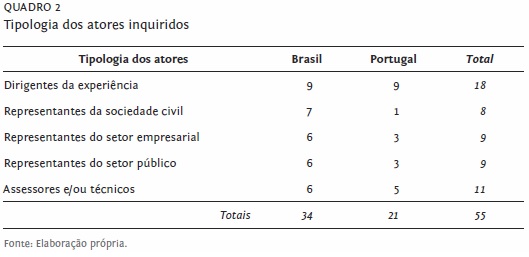 Quanto à tipologia dos atores envolvidos, optou-se por atingir, em cada experiência, um dirigente, um assessor técnico, um representante da sociedade civil, um do setor empresarial e um do setor público (v. Quadro 2).