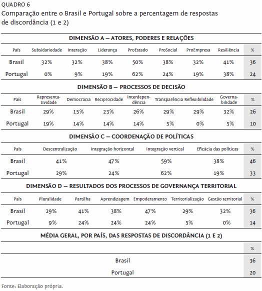 Tomando separadamente os dados relativos ao Brasil e a Portugal, conforme o quadro 6, é possível fazer análises comparativas, considerando as respostas dos inquiridos. Algumas questões merecem destaque: (a) quanto à avaliação feita pelos inquiridos, ela é significativamente mais otimista em Portugal; (b) em alguns aspetos, há grandes diferenças quanto à avaliação, a exemplo dos princípios da subsidiariedade, interação, transparência, reflexibilidade, governabilidade, pluralidade, territorialização e gestão territorial; (c) apesar disso, há coincidências significativas, como a forte discordância no que se refere aos princípios do protagonismo estatal e da integração vertical e, ainda que de forma menos significativa, aos princípios do protagonismo social, resiliência, descentralização de políticas, integração horizontal, partilha, aprendizagem interativa e empoderamento de atores, com percentagens de discordância acima de 23%; (d) outra coincidência surge em relação aos princípios referentes à dimensão coordenação de políticas nos territórios, os quais, tanto no Brasil como em Portugal, estão entre os que receberam maior número de avaliações de discordância.