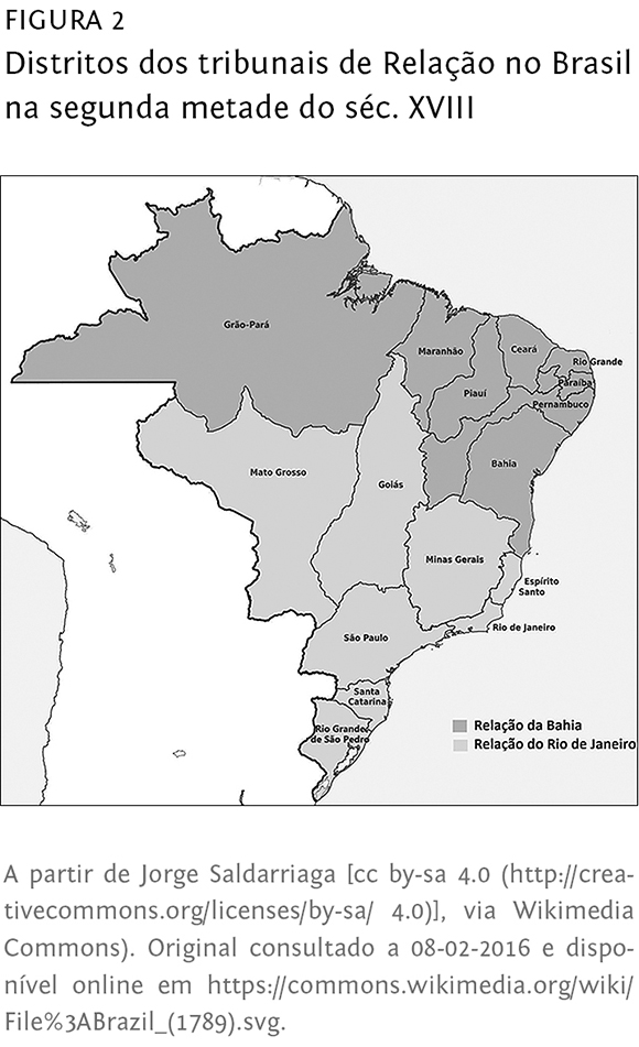 O Conselho Ultramarino acaba por produzir novo parecer favorável ao estabelecimento do tribunal e, no ano seguinte, em 1751, será dado o regimento que dava forma ao novo tribunal no Rio de Janeiro,[35] com jurisdição sobre as capitanias a sul da do Espírito Santo (cf. Figura 2).
