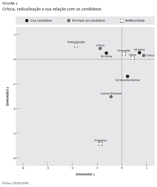 A análise de correspondência múltipla contribui para a confirmação da hipótese deste trabalho, de que há diferenças de radicalização no debate a partir dos candidatos. Observa-se que a presença da radicalização - que também engloba ataques e agressões verbais - no debate sobre as eleições de 2014 esteve diretamente relacionada com a citação e a crítica a Rousseff. Há um percentual muito grande de comentários cuja reflexividade é de radicalização, o formato é de crítica ao candidato e a única presidenciável mencionada é a incumbente. Por outro lado, não há relações de proximidade entre menções aos demais candidatos com o formato de crítica, tampouco com a radicalização enquanto reflexividade. Por exemplo, nota-se que a categoria radicalização se distancia, principalmente, da menção ao principal candidato da oposição, Aécio Neves, bem como do formato elogio ao candidato.