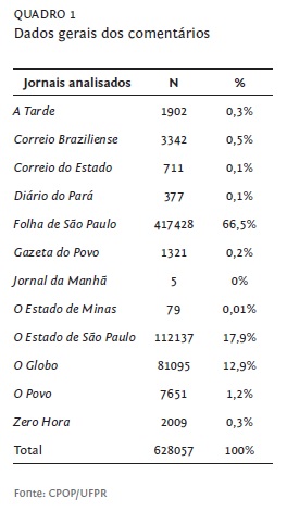 Por meio dos comentários, os veículos convencionais abrem espaço para receber feedback dos seus leitores, o que lhes permite expressarem-se sobre determinado tema, por meio da reação a um conteúdo jornalístico produzido (Silva, 2013). Estudos como o de Sampaio e Barros (2010), Cervi (2013), Strandberg e Berg (2013) e Mitozo, Massuchin e Carvalho (2015) também analisam a relação entre periódicos e webleitores, e observam que estes últimos não são, necessariamente, o público leitor do jornal impresso. Os jornais possuem um número muito maior de seguidores - que podem ser de distintos perfis e lugares - do que de assinantes das versões impressas.[2]