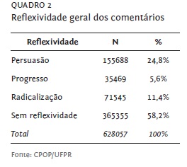 Já a reflexividade diz respeito à forma como o comentador se posiciona diante dos demais para participar no debate. A partir de Jenssen e Kies (2004), foram definidas três categorias para a pesquisa além de uma quarta para casos que não se enquadravam nas já existentes. A primeira categoria é a persuasão, que pode ser definida pela tentativa de um participante persuadir outro, sendo que no caso das eleições isso pode ocorrer quando o comentador tenta convencer outro eleitor a votar no seu candidato, por exemplo. A categoria progresso, por outro lado, enquadra os comentários que apenas agregam novas informações e nos quais é possível perceber que há o intuito de levar adiante a discussão, sendo que há respeito mútuo e consideração pelos conteúdos adicionados ao processo de debate. Já no caso da radicalização, categoria importante na análise de dados proposta, percebe-se que o comentador demonstra explicitamente uma reação negativa à postagem ou ao comentário e passa a questionar a posição do debatedor anterior, ou mesmo a ofendê-lo, causando rutura no dialógo entre os participantes. Em muitos casos, nota-se desrespeito e a utilização de termos ofensivos, seja para referir os candidatos, seja em relação ao comentador ou a qualquer pessoa ou instituição.