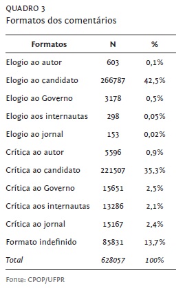 Enquanto na variável reflexividade se pode identificar apenas o radicalismo, sem saber se se direciona aos candidatos, a variável formato permite observar de modo mais claro a ênfase do conteúdo do comentário. Os formatos, como mostra o quadro 3, classificam-se em diferentes tipos de críticas e elogios, além do formato indefinido.