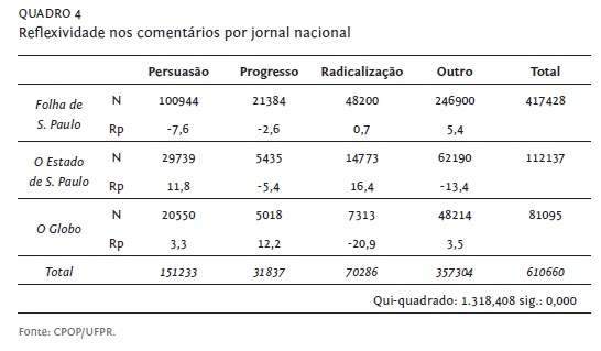 Ao observar de modo específico o debate que ocorre nos três periódicos nacionais - Folha de S. Paulo, O Estado de S. Paulo e O Globo - e relacionar com os diferentes tipos de reflexividade, é possível notar se alguns comentadores de determinados periódicos tendem a ser mais ou menos radicais. A relação, exposta na tabela abaixo, é significativa, com qui-quadrado de 1 318,408 (Sig. 0,000), o que indica que há uma relação de dependência entre as variáveis e que as categorias se distribuem distintamente pelos três periódicos. No teste de resíduos padronizados[12], o valor mais alto é de 16,4, o que sugere tendência a aparecer mais radicalização em O Estado de S. Paulo. Por outro lado, a persuasão está mais próxima do periódico Folha de S. Paulo, com resíduo de 11,8. O progresso, ao contrário, concentra-se nos comentários de O Globo.