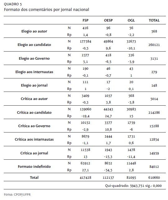 De modo complementar, observa-se o formato dos comentários nos três veículos, comparativamente. De novo pode-se perceber que a distribuição dos formatos ocorre de modo diferenciado entre os três veículos aqui considerados. Esta afirmação é destacada pelo qui-quadrado significativo de 5 943,751 (Sig. 0,000). Na Folha de S. Paulo, concentram-se os comentários com elogios ao governo e críticas ao jornal. O que demonstra que, em alguns casos, por mais que a disputa eleitoral esteja em evidência, a crítica do leitor nas redes sociais se volta para a própria imprensa. Por outro lado, os elogios direcionados aos candidatos - da mesma forma que a crítica ao autor, crítica ao candidato ou crítica ao governo - aparecem mais em O Estado de S. Paulo. A crítica ao candidato também sobressai em O Globo. De entre os resíduos padronizados mais altos, o que chama mais a atenção é o valor de 24,7 das críticas aos candidatos que se concentram acima do que se esperava, novamente, no periódico O Estado de S. Paulo. Aparentemente, tem-se aqui um ambiente mais propício e com comentadores mais dispostos tanto a criticar quanto a radicalizar o debate, distanciando-se ainda mais do modelo de um debate respeitoso, argumentado e com posições justificadas (Sampaio, Maia e Marques, 2011).