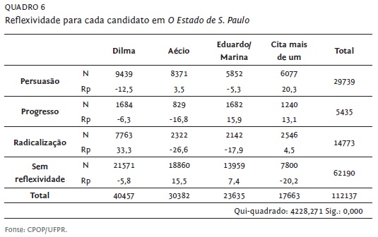 Os resíduos indicam que a radicalização caracteriza muito mais os comentários que citam Dilma Rousseff em relação aos demais candidatos, que se aproximam muito mais da persuasão (Aécio Neves) ou do progresso (Marina Silva). Inclusive, é o resíduo padronizado mais alto, de 33,3. Este dado indica que os comentários que citam Rouseff são os mais radicais. No entanto, como a radicalização pode ocorrer em relação a comentadores, jornal ou governo, não se pode garantir, apenas por estes dados, que são direcionadas à candidata. Obviamente, comprova-se uma radicalização por parte dos comentadores que citam Dilma Rousseff, todavia não se sabe exatamente se a radicalização ocorre em relação à candidata. Isto porque a análise da variável reflexividade limita-se a indicar o comportamento do comentador perante o debate, seguindo a proposta de Janssen e Kies (2004). Um comentário pode, por exemplo, representar apoio à candidata, mas a partir de um comentário radical perante os demais comentadores.