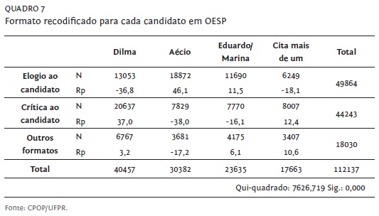 Entre críticas e elogios agrupados, não há muitas diferenças: 44 % de elogios e 42,3 % de críticas. Os formatos que não são baseados em críticas ou elogios representam apenas 13,7 % do total. Deve-se destacar que, na sua maioria, os elogios e as críticas são evidentes e pouco baseados em conteúdos mais contextuais. Restringem-se, unicamente, a criticar ou promover o candidato, o governo ou o jornal de notícias. Isso aproxima-se do modelo encontrado por Berrocal, Redondo e Campos-Domínguez (2014), pois as autoras também perceberam conteúdos muito curtos e com pouca informação.