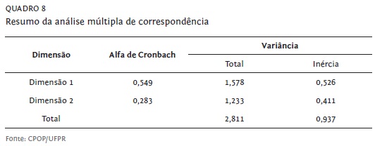 Primeiramente, observa-se no quadro 8 o resumo dos dados estatísticos dessa análise. A partir da média do alfa de Cronbach, é possível afimar que o modelo da análise de correspondência múltipla, ilustrada pelo gráfico adiante, explica 43 % da variância conjunta das três variáveis, categóricas e independentes entre si. O resumo informa, ainda, que a dimensão 1 é mais informativa (α = 0,549), com força de explicação superior à dimensão 2 (α = 0,283). Logo, as informações mais relevantes são, no plano do gráfico 1, os pontos que mais se aproximam e se distanciam horizontalmente, no eixo x.