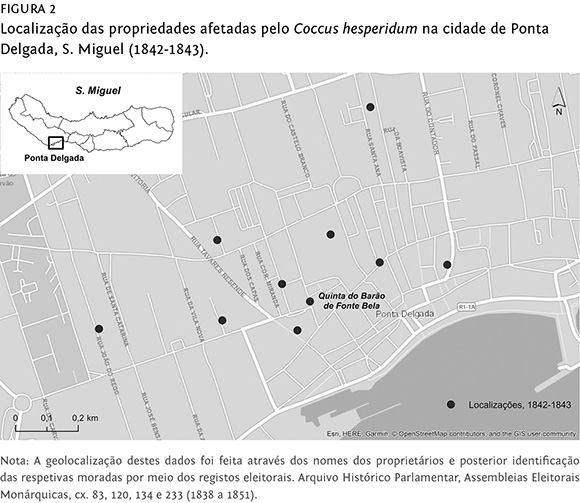 As árvores que estavam na origem do pomar invadido tinham vindo da ilha do Faial, cerca de 5 anos antes. Realizado um levantamento minucioso da situação dos laranjais, descobriu-se que a sua presença tinha sido negligenciada por um outro vizinho, no ano anterior.[10] A data do primeiro registo da invasão na cidade recuou, assim, para 1842. A área afetada já era mais extensa do que se pensava, e o inseto pululava num conjunto de propriedades, todas na proximidade da Quinta do Barão de Fonte Bela, facto que reforçou a hipótese de ser este o foco original na ilha (Figura 2).[11]