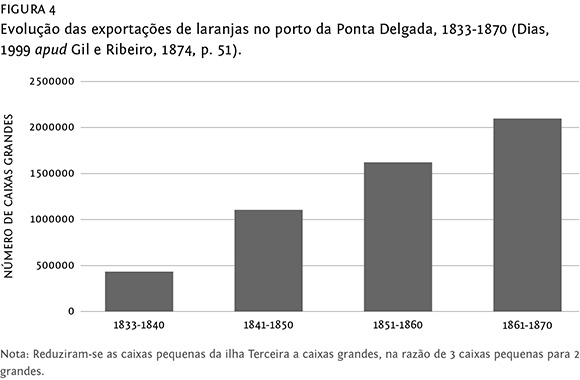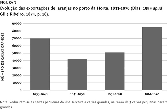 Na década de 1840, os números de caixas grandes de laranja exportados pelo porto da Horta revelavam um acentuado decréscimo, correspondente a -40,4 % face à década de 1830 (Figura 3), refletindo os efeitos da praga e o corte dos laranjais.