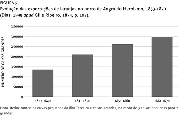 No porto de Angra do Heroísmo, o comércio externo da laranja rondava as 136 mil caixas grandes nos anos de 1833 a 1840, e não parou de crescer até à década de 1860, chegando a ca. 300 000 (Figura 5). Para este aumento terão contribuído as plantações de novos pomares, advogadas pela Junta Geral do Distrito[43] , e quiçá as respostas locais na prevenção e combate dadas pelos governadores civis, administradores dos concelhos e da alfândega, e dos lavradores da ilha.