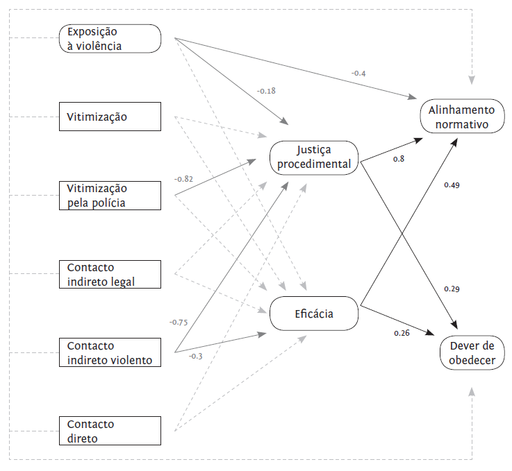 Algumas variáveis têm, no entanto, um efeito indireto sobre a legitimidade mediado pelas duas dimensões de confiança na polícia. É o caso de contacto indireto violento, da vitimização policial e da exposição à violência: essas variáveis estão associadas a mudanças no grau de confiança na polícia por parte dos adolescentes, o que por sua vez transmite o efeito e impacta mudanças nos julgamentos de legitimidade da polícia por parte dos adolescentes.