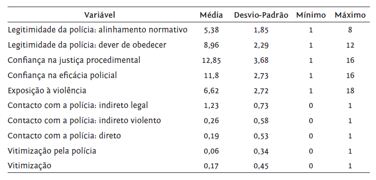 No que se refere ao contacto com a polícia, o questionário reúne circunstâncias em que os adolescentes entrevistados poderiam ter estabelecido algum contacto com agentes da polícia num período de até um ano antes da entrevista. Neste artigo, essas circunstâncias foram agrupadas da seguinte forma: “Contato indireto legal” para quando presenciaram a polícia exercendo as suas funções, mas não eram diretamente alvo do trabalho policial, expresso em frases como “você viu a polícia parar e revistar alguém na rua?” e “você viu a polícia algemando e prendendo alguém?”; “Contato indireto violento” reúne ocasiões em que presenciaram a polícia a usar a força contra outrem: “você viu a polícia batendo em alguém?” e “você viu a polícia humilhando alguém, por exemplo, xingando, rasgando documentos?”; “Contato direto” diz respeito a experiências diretas com o trabalho policial: ter sido parado pela polícia, ter sido revistado pela polícia ou ter sido encaminhado pela polícia a um Distrito Policial. Os itens foram elaborados considerando não só experiências, que são as mais frequentes nessa faixa etária (Rodrigues e Gomes, 2019), como também considera circunstâncias de maior gravidade. Todas as respostas são captadas em escalas de quatro pontos para frequência (3 = muitas vezes; 0 = não). As questões foram posteriormente aglomeradas e dicotomizadas de modo a constituírem uma variável binária indicando alguma experiência de contacto ou não.