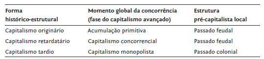 Em suma, a origem, a estrutura e a dinâmica dos capitalismos na América Latina não são redutíveis à determinação por um dos polos da mediação externo-interno. Embora a transformação mundial seja sobredeterminante, há, nos diversos casos nacionais, diferentes graus de autonomia relativa que devem ser analisados com rigor, inclusive para entender os seus limites e as suas potencialidades estruturais.