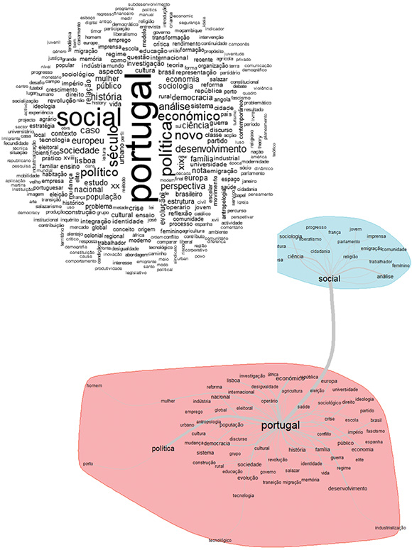 Figura 1 Nuvem e árvore das associações das palavras usadas nos títulos dos artigos publicados na Análise Social. Nota. Na nuvem de palavras, quanto maior o tamanho da palavra, mais frequentemente ela foi usada nos títulos das publicações. Na árvore das associações entre palavras, a força da associação entre as palavras é representada pela espessura dos ramos: quanto mais espesso é o ramo, mais forte é a associação entre as palavras; os agrupamentos e suas palavras-núcleo representam maior similaridade dentro dos agrupamentos, e maior dissimilaridade entre agrupamentos.