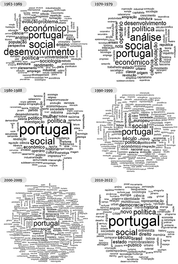A Figura 2 apresenta as nuvens de palavras em cada uma das categorias temporais que adotámos. Destaca-se a palavra “Portugal” como a mais frequente em cada uma das décadas, com menor destaque ao partilhar o seu protagonismo com as palavras “análise” e “social” entre 1970 e 1979. Este fenómeno poderia levar-nos a sintetizar os títulos como aludindo meramente à “Análise Social de Portugal”. Interessante notar que a maior frequência relativa de palavras que aludem ao desenvolvimento socioeconómico do país nas primeiras décadas parece ter gradualmente dado lugar a palavras que sugerem uma ligeira mudança de foco, passando a abordar aspetos mais diversificados relacionados com fatores mais político-sociais. Isto pode significar uma maior diversificação temática reportada nos títulos das publicações com o passar do tempo sem perder a referência ao princípio organizador geral representado na palavra “Portugal”. O centramento em Portugal, como espaço privilegiado da investigação científico-social publicada na Análise Social vai, contudo, disputando algum terreno com outros espaços progressivamente relevantes: destacam-se o termos “europeu” na década de noventa e, mais recentemente (período 2010-2022), surgem as palavras “Brasil” e “brasileiro.”