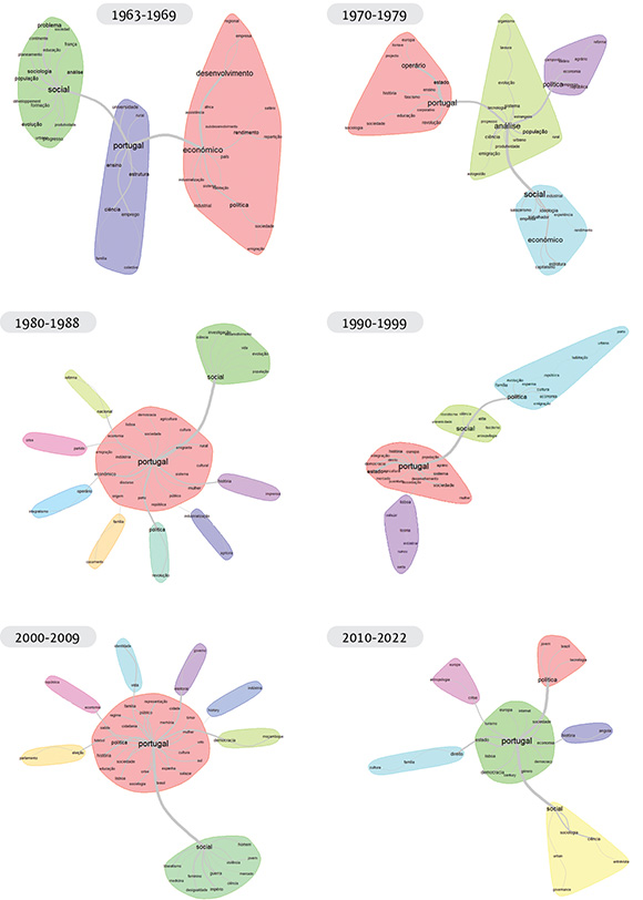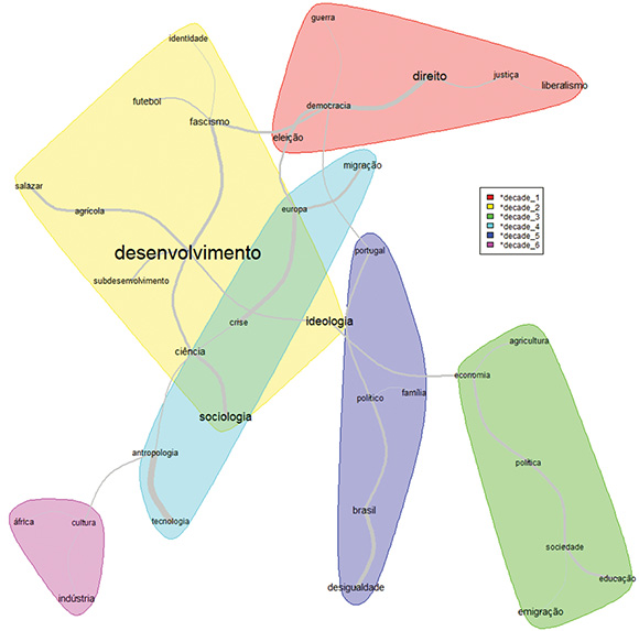 Nas primeiras décadas, a questão do desenvolvimento social e económico foi absolutamente central. Mas existem outros conceitos latentes que já eram relevantes. Por exemplo, na década 1 (1963-1969), um quadro conceptual salientava, de modo latente, alguns “aspectos formais da democracia liberal num contexto de guerra” (algumas palavras distintivas foram liberalismo, justiça, direito, democracia). Esta preocupação emergiu de forma distintiva nesta fase, porque este conceito gerou mais associações do que outros conceitos latentes. Semanticamente, essa década liga-se, aliás, à década 2 (1970-1979), por meio da relação entre as palavras “democracia” (década 1) e “fascismo” (década 2). Nos anos 70 (década 2), as palavras “sociologia”, “ciência” e “ideologia” articulam-se com a questão do desenvolvimento, dando corpo, de forma latente, a uma “sociologia das ideologias de desenvolvimento.” A nossa análise mostra que o tema da ideologia estabelece um elo com a década seguinte (década 3: 1980-1989), destacando a relação entre “ideologia” e “emigração”. Nessa década 3, encontram-se os termos emigração, economia, agricultura, política, sociedade e educação. As preocupações com a estrutura produtiva e os seus problemas alia-se à tematização da questão educativa, outro conceito latente relevado pela análise. Exceto pela ligação com a década 2, o agrupamento de vocábulos da década 3 não faz ligação com nenhuma outra década.
