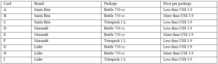 3.9 per package and more than US$ 3.9 per package, since the wines priced under US$ 3.9 are related to lower quality and the wines over this price are considered of better quality. The national currency values (Chilean pesos) were converted to dollars using the average 2010 value (Ch$510.25/US$). From these attributes and levels a total of 12 combinations (3 x 2 x 2) were obtained; however because wines are not sold in 1 L tetrapacks for more than US$ 3.9 per package, the alternatives considered for this combination were eliminated. This allowed the number of stimuli to be reduced to nine with one specification for each attribute (Table I). Each respondent ordered the cards with the combination of attributes from most to least preferred, on a scale of 1 to 9, where 1 = most preferred; 9 = least preferred.