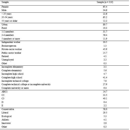 Of all the surveys applied (n = 400), only 79.8% of respondents indicated that they consume wine (n = 319), so it was decided to work with this sample size. Table II presents a description of this sample. The largest proportion of the sample consisted of women (65.4%), aged between 35 and 54 years (65.2%), resident in urban areas (89.7%), with family groups consisting of three to four people (56.4%), independent worker (30,5%) and private-sector worker (30.5%), with complete secondary education (41.4%), belonging to the middle-low (40.1%) and middle-middle (33.5%) socioeconomic level and with a conservative lifestyle (58.0%). The greatest proportion of participants consume wine occasionally (74.9%, Table III, choose the purchase based on personal preferences (65.8%), decide what brand to buy in the supermarket (48.3%) and choose the brand that they trust (82.8%). In case of non-conformity with the product acquired, a high proportion reacts definitively by changing brands (84.6%). Only 52% know what it means that a product has store brand,