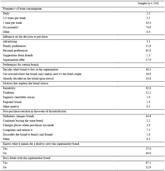 The questionnaire used contained closed questions about wine consumption habits in the household, factors that influence the decision to purchase wine, the place where it is decided that the brand will be bought, the reasons that explain the brand choice and post-purchase reaction in the event of dissatisfaction with the product. In relation to store brands, respondents were asked if they knew what it means if a product has the supermarket brand where they buy it. After reading the following definition of store brands: "the store brands or private labels are generally brands created for, controlled by, and/or sold to retailers, but the products are made by companies that package and label with the supermarket brand, even though they may have competing brands on the shelf", they were then asked if they had previously bought store-brand foods or drinks.